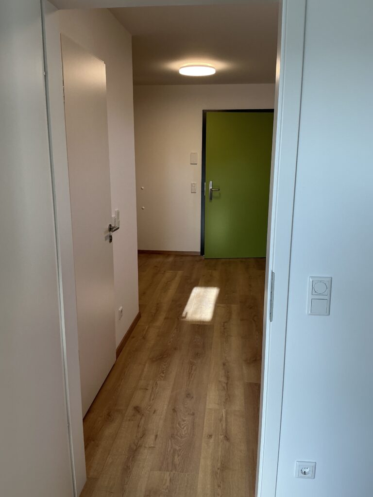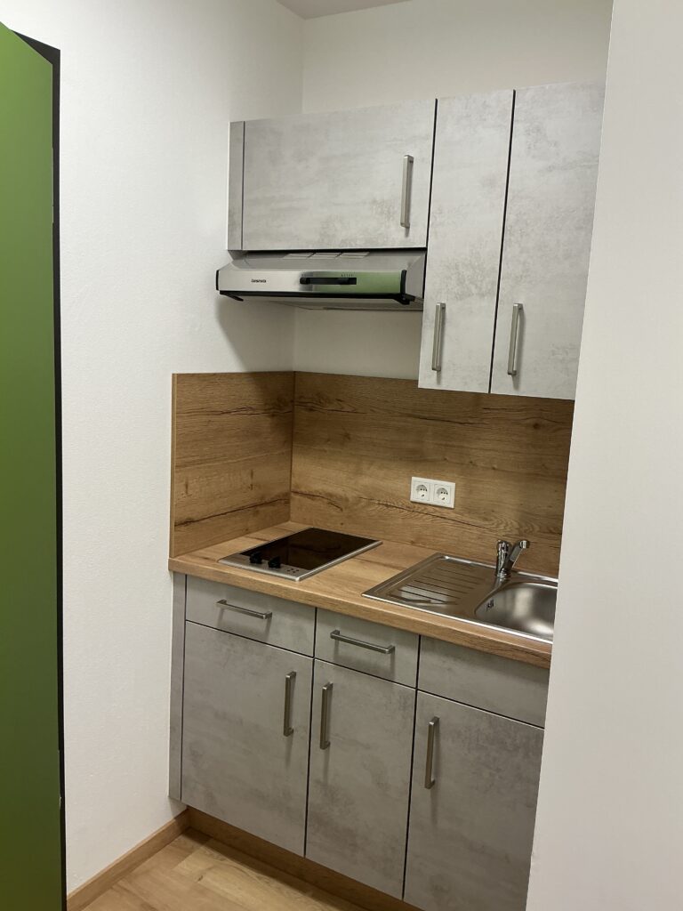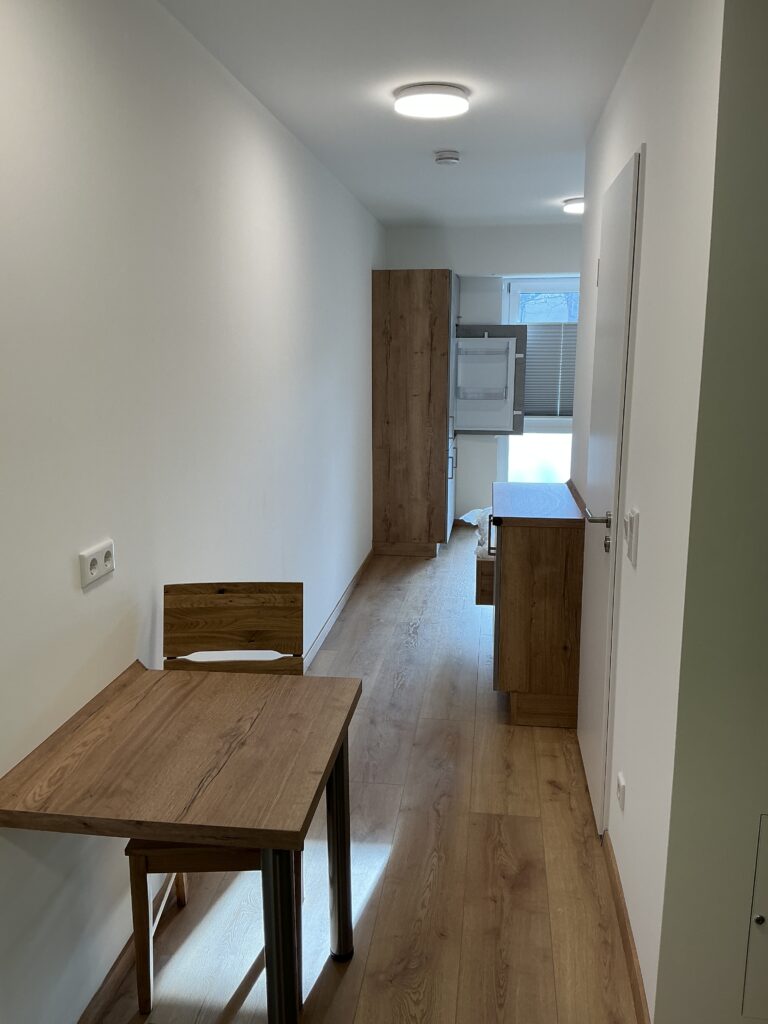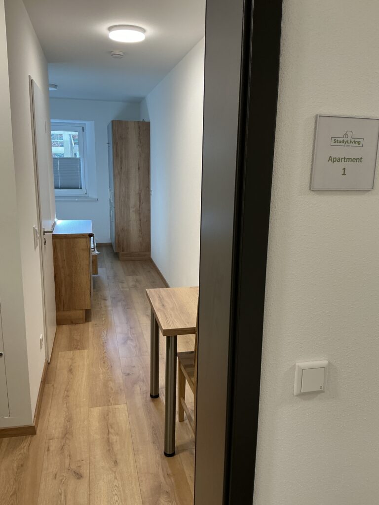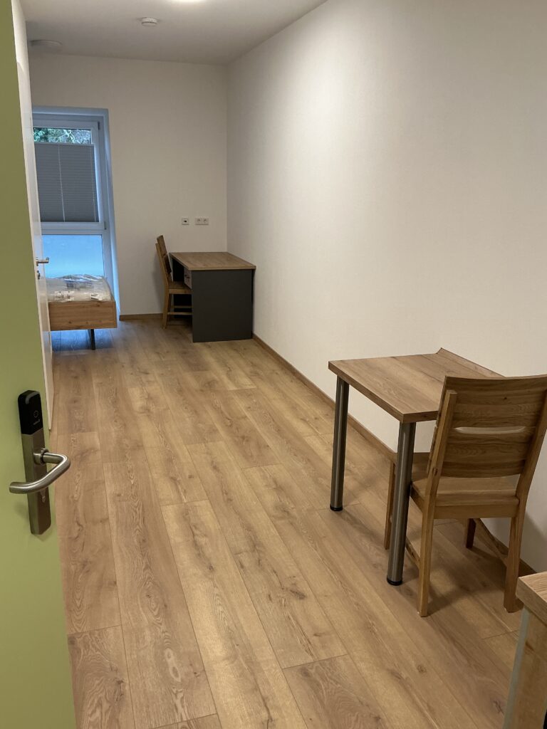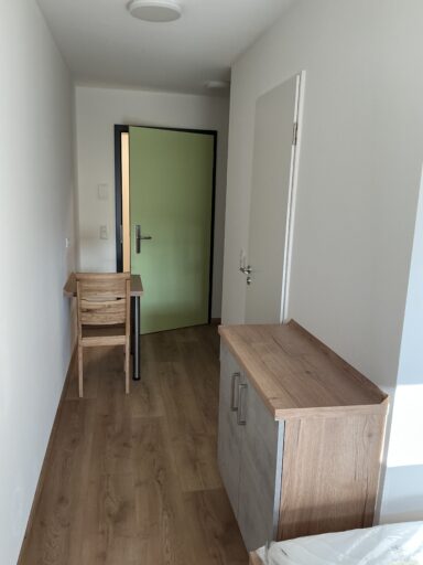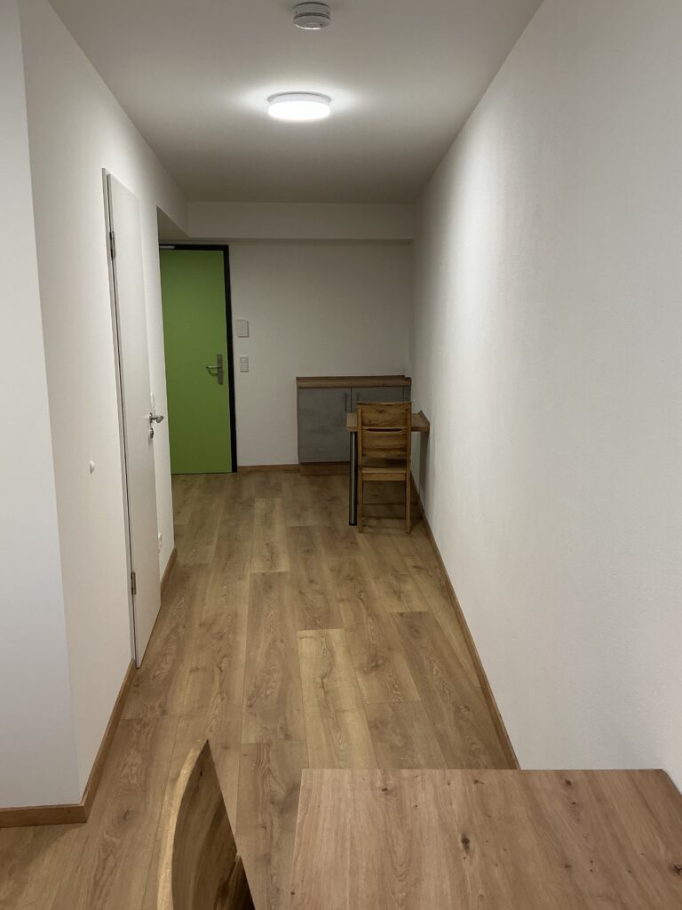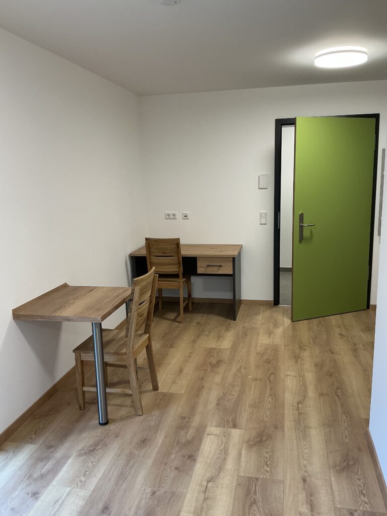 Das Erdgeschoss erreicht man direkt von der Straße „Auf der Schanze“ – der Haupteingang ist aber im Innenhof im 3. Untergeschoss. Wenn du mal raus aus deinem Apartment willst, wartet im Haus ein gemütlicher Gemeinschaftsraum auf dich. Hier kannst du Leute kennenlernen, gemeinsam lernen oder einfach den Feierabend drinnen oder im angrenzenden Garten genießen.